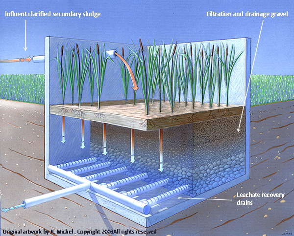 The planted reedbeds grow roots and a thick mat of rootlets called rhizomes that act as a bio-pump to facilitate air and water transfers in the filter bed and sludges.