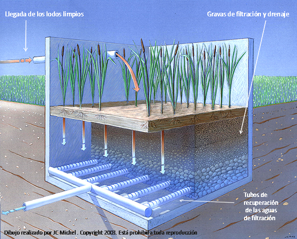 Los juncos desarrollan raíces y grandes tallos subterráneos llamados rizomas que facilitan las transferencias de aire y de agua en la masa filtrante y los lodos.
