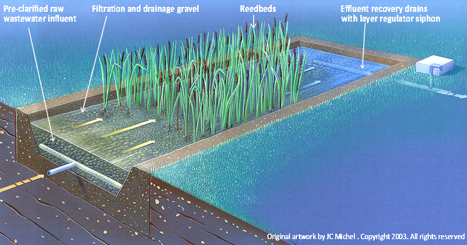 Reeds (Phragmites spp.) and cattails (Typha spp.) are appropriate for use in horizontal-flow wetland filtration.