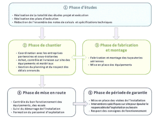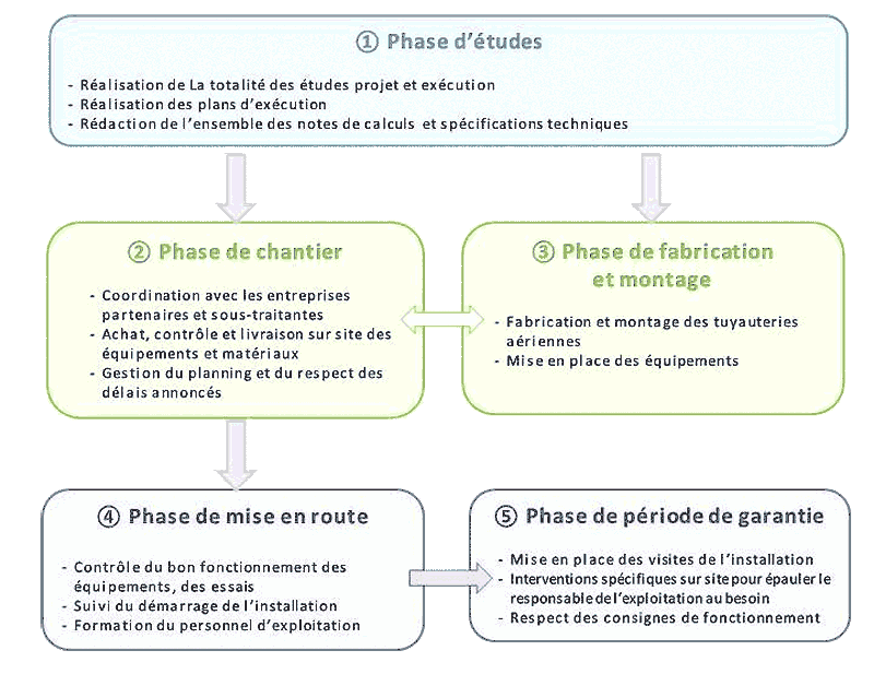 Chaque phase est sous le contrôle d’un maître d’œuvre (Ingénieur Conseil) agissant pour le compte d’un maître d’ouvrage (commune, communauté de communes…).